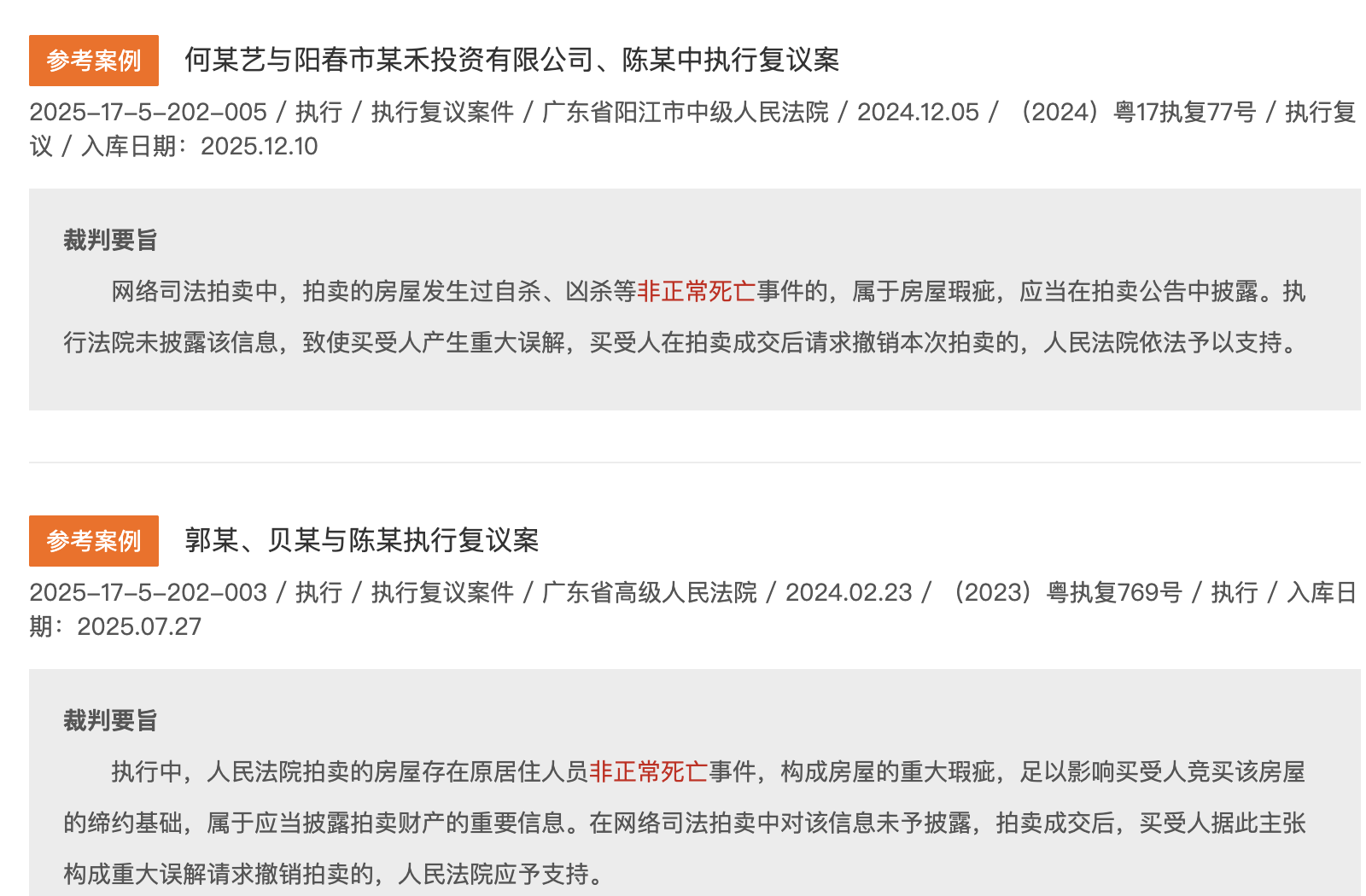 法拍买到未充分披露信息的“凶宅”,能否申请撤销拍卖行为?2025年以来,公布的两起参考案例均认为,拍卖的房屋发生过非正常死亡事件属于房屋瑕疵,执行法院未披露该信息的,买受人在拍卖成交后请求撤销,人民法院应予支持。