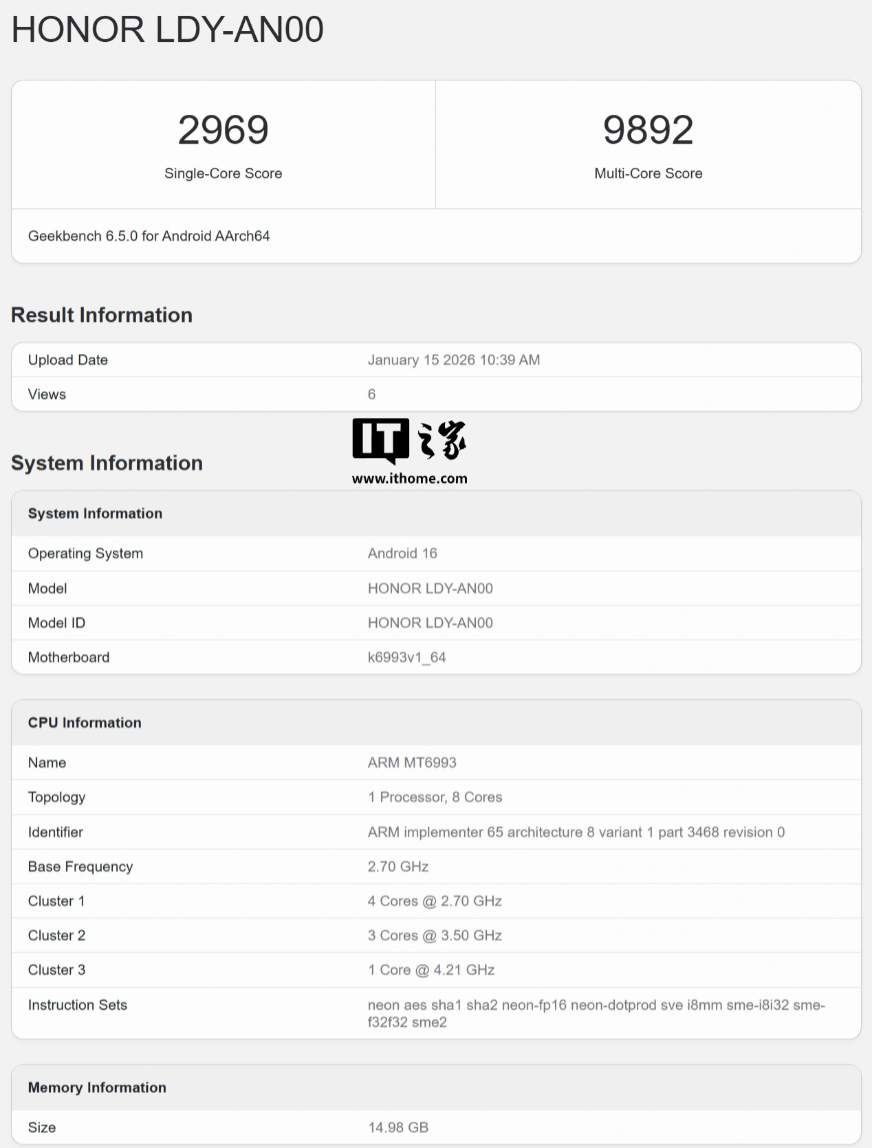 IT之家1月16日消息,型号为LDY-AN00的荣耀手机昨日(1月15日)现身GeekBench跑分库,6.5.0单核成绩为2969分,多核成绩为9892分,基于此前GSMA IMEI数据库信息,该型号对应荣耀Magic8Pro Air手机。