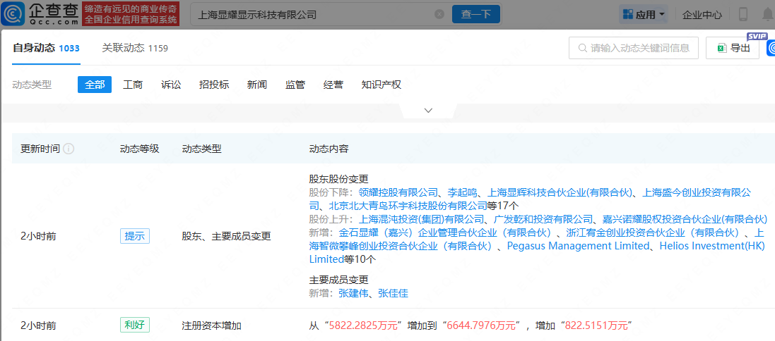 近日,上海显耀显示科技有限公司发生工商变更,注册资本增加到6644.80万元,新增茅台金石基金旗下金石显耀(嘉兴)企业管理合伙企业(有限合伙)、浙江宥金创业投资合伙企业(有限合伙)等为股东,同时,公司主要人员亦发生变更。企查查显示优配中国,上海显耀显示科技有限公司(JBD)成立于2015年10月,法定代表人为李起鸣。官网显示,公司专注于MicroLED微显示技术的研发与创新。